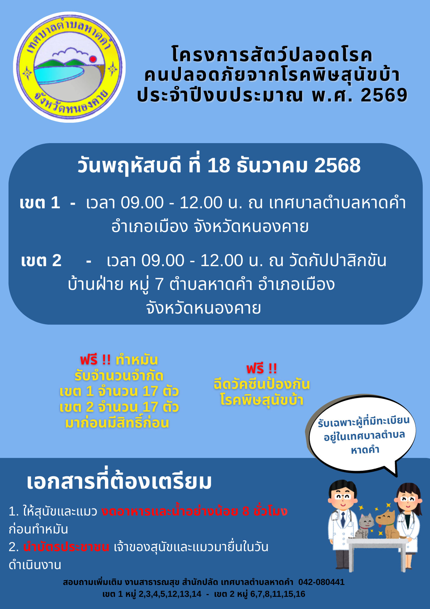 ประชาสัมพันธ์โครงการสัตว์ปลอดโรค คนปลอดภัยจากโรคพิษสุนัขบ้า เทศบาลขอเชิญชวนประชาชนในเขตพื้นที่ นำสุนัขและแมวเข้ารับ การฉีดวัคซีนป้องกันโรคพิษสุนัขบ้า การทำหมันสุนัขและแมว (ควบคุมประชากรสัตว์)