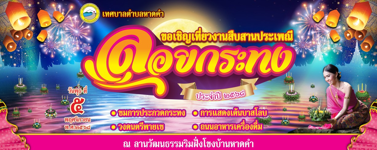 ขอเชิญชวนเที่ยวงานวันลอยกระทง ประจำปี 2568 โดยนายถาวร ชัยจันทร์ นายกเทศมนตรีตำบลหาดคำ ขอเชิญชวนพ่อแม่พี่น้องทุกท่าน ร่วมสืบสานประเพณีไทย "วันลอยกระทง" ในวันพุธที่ 5 พฤศจิกายน 2568 ณ บริเวณลานวัฒธรรมริมฝั่งโขงบ้านหาดคำ