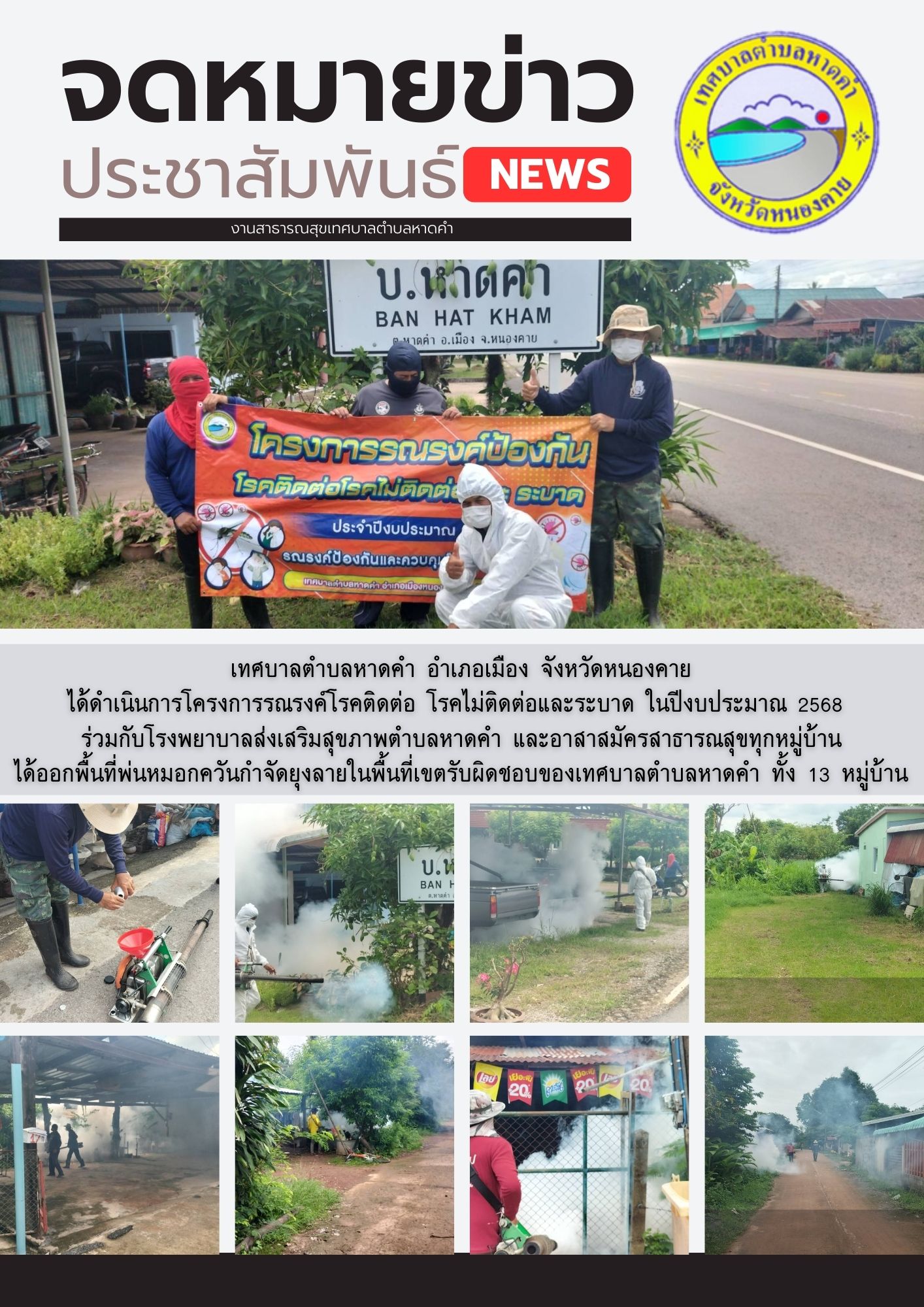 เทศบาลตำบลหาดคำ อำเภอเมือง จังหวัดหนองคาย ได้ดำเนินการโครงการรณรงค์โรคติดต่อ โรคไม่ติดต่อและระบาด ในปีงบประมาณ 2568 ร่วมกับโรงพยาบาลส่งเสริมสุขภาพตำบลหาดคำ และอาสาสมัครสาธารณสุขทุกหมู่บ้าน ได้ออกพื้นที่พ่นหมอกควันกำจัดยุงลายในพื้นที่เขตรับผิดชอบของเทศบาล