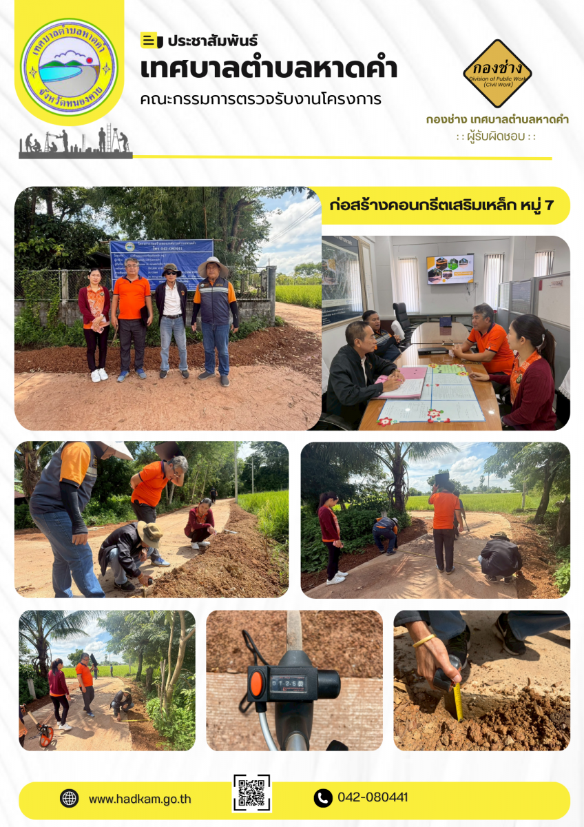 วันศุกร์ ที่ 19 กันยายน เวลา 10.00 น. กองช่างเทศบาลตำบลหาดคำร่วมกับคณะกรรมตรวจรับพัสดุ ร่วมตรวจงานโครงการก่อสร้างคอนกรีตเสริมเหล็ก หมู่ 7